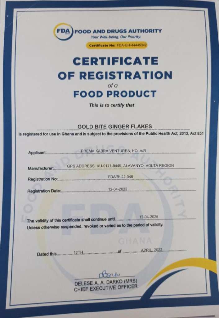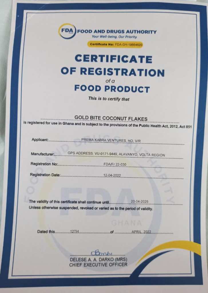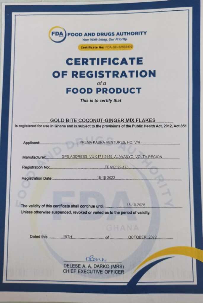 We’re a Flakes producing Enterprise with Registration No. BN924011121 and have been registered by the Company Registrar General of Ghana since 24th November 2021. Our Coconut & Ginger Flakes are of the highest quality and have been approved by the Food & Drug Authority of Ghana. They’re perfect for anyone, regardless of age or gender. Our flakes can be chewed for health benefits, added as toppings to any food, or used to make Ginger Tea or added to warm milk for a delicious taste. They’re baked, not fried, with no sugar, preservatives, or oil added. We only use Coconut & Honey or Ginger & Honey to make them.