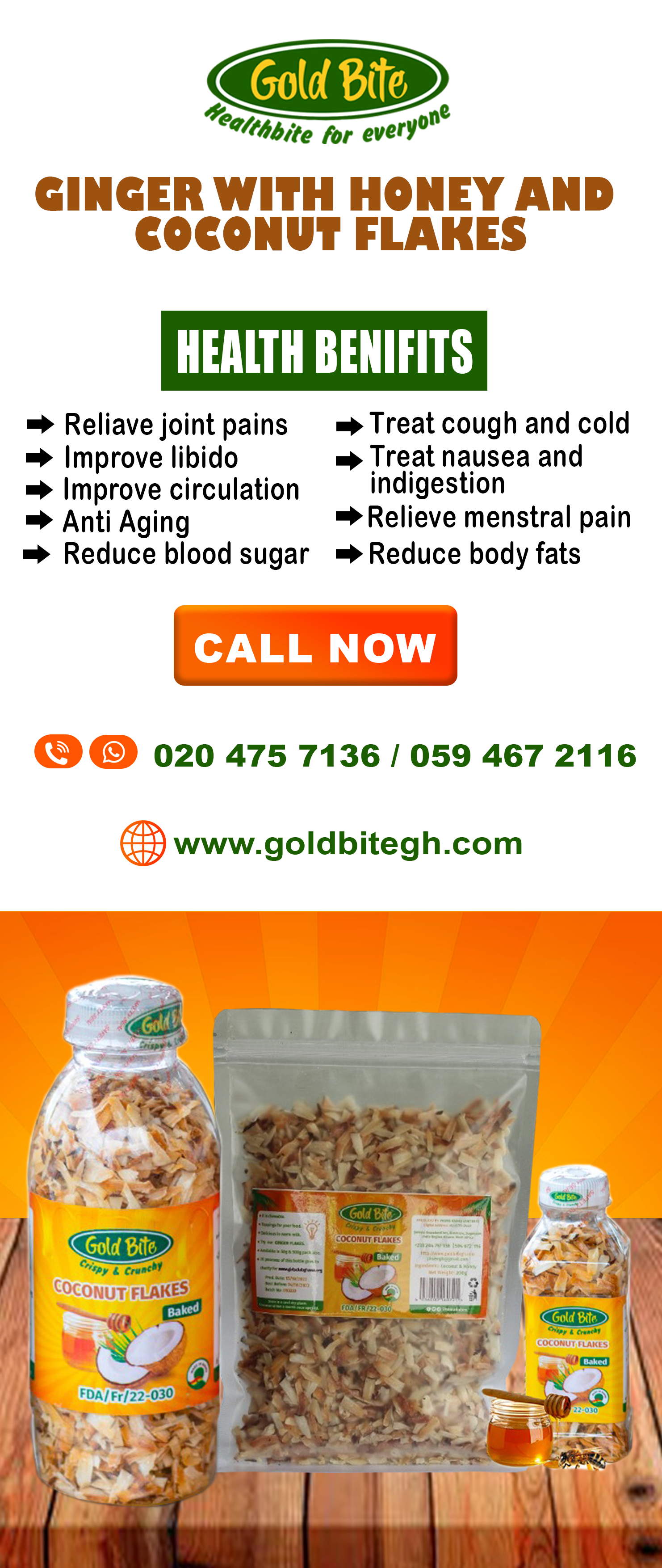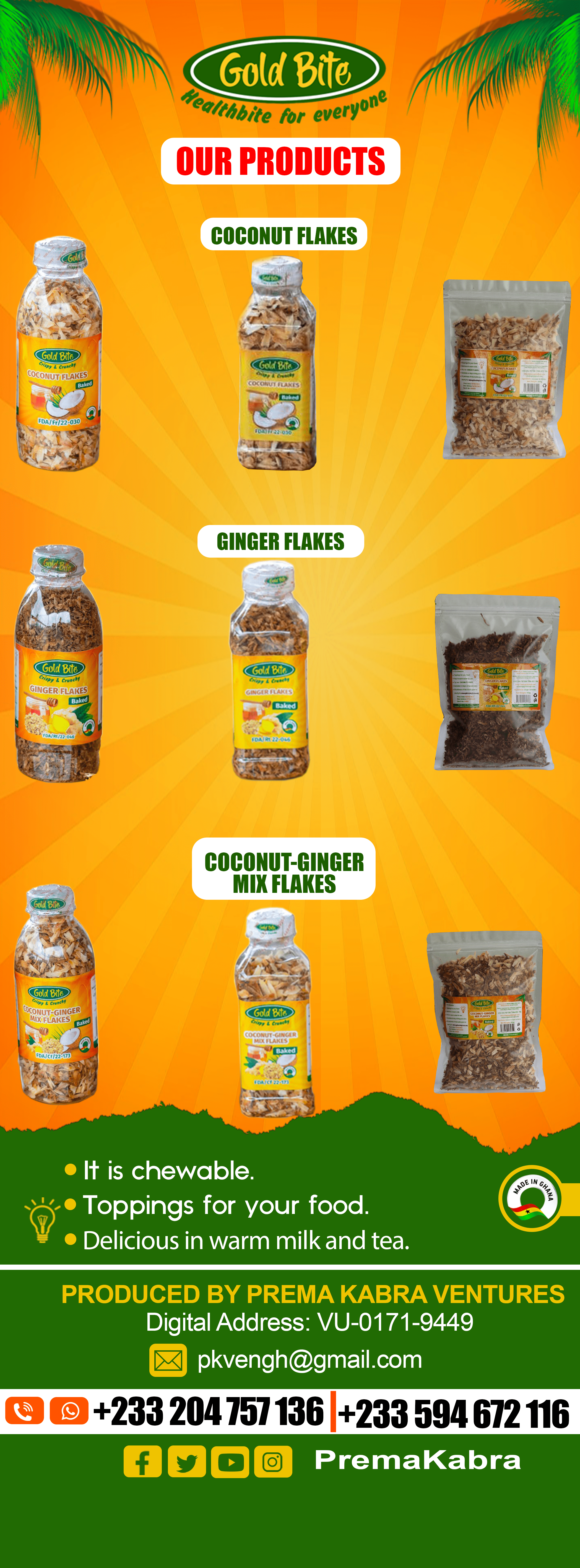 We are Flakes producing Enterprise, bearing Registration No. BN924011121 registered by the Company Registrar General of Ghana. We produce Coconut, Ground nut, Ginger, Tiger nut & Mix Flakes which can be consumed by anyone – young, old, men, women- everyone, irrespective of age and gender. The products are of very high quality and have been approved by the Food & Drug Authority of Ghana.